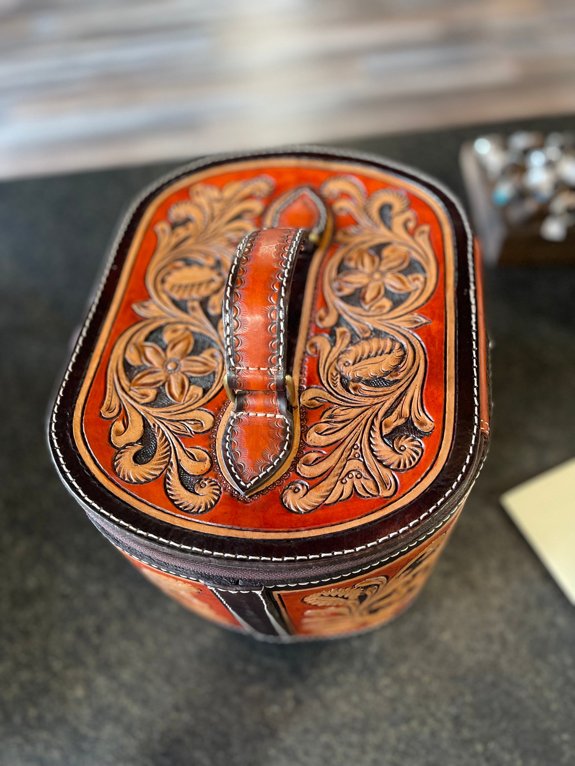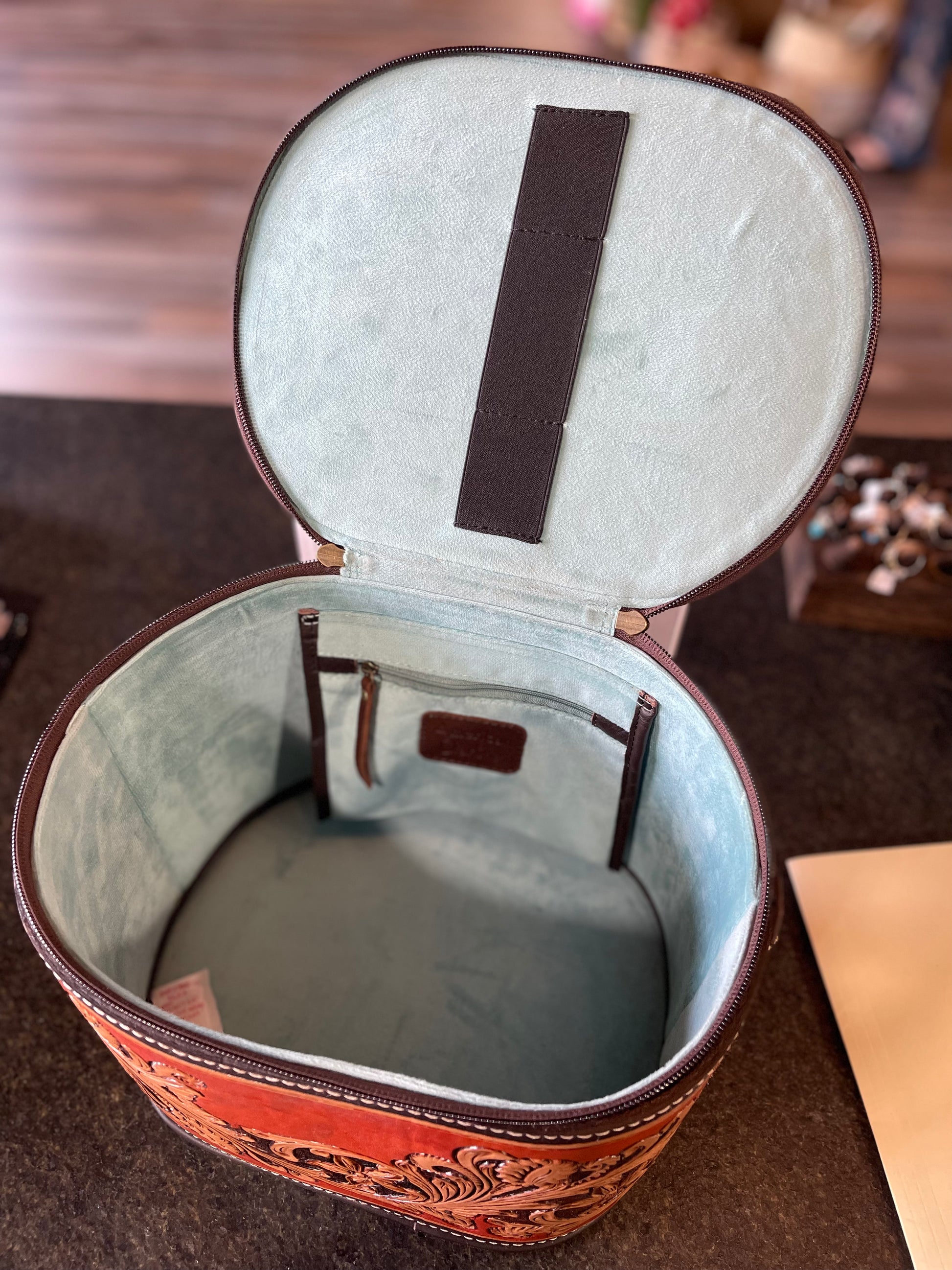 Hand carved leather leather toiletry bag. Teal velvet interior.