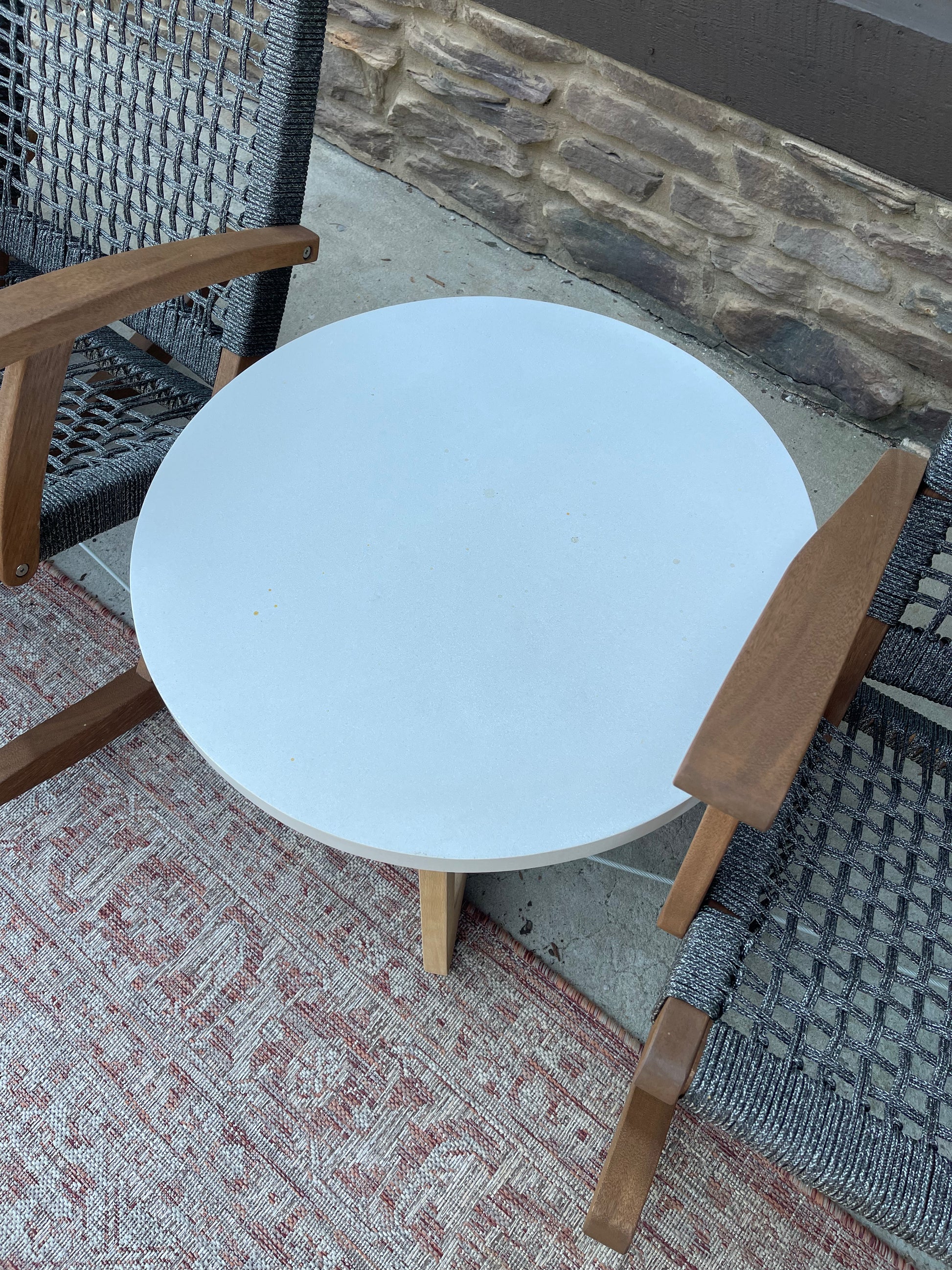 The Ivory Composite Top Accent Table is made from a poly-resin and powdered concrete blend for texture and density. This mixture is molded into a powder-coated steel frame for support and stability, built for long-lasting durability in all climates.