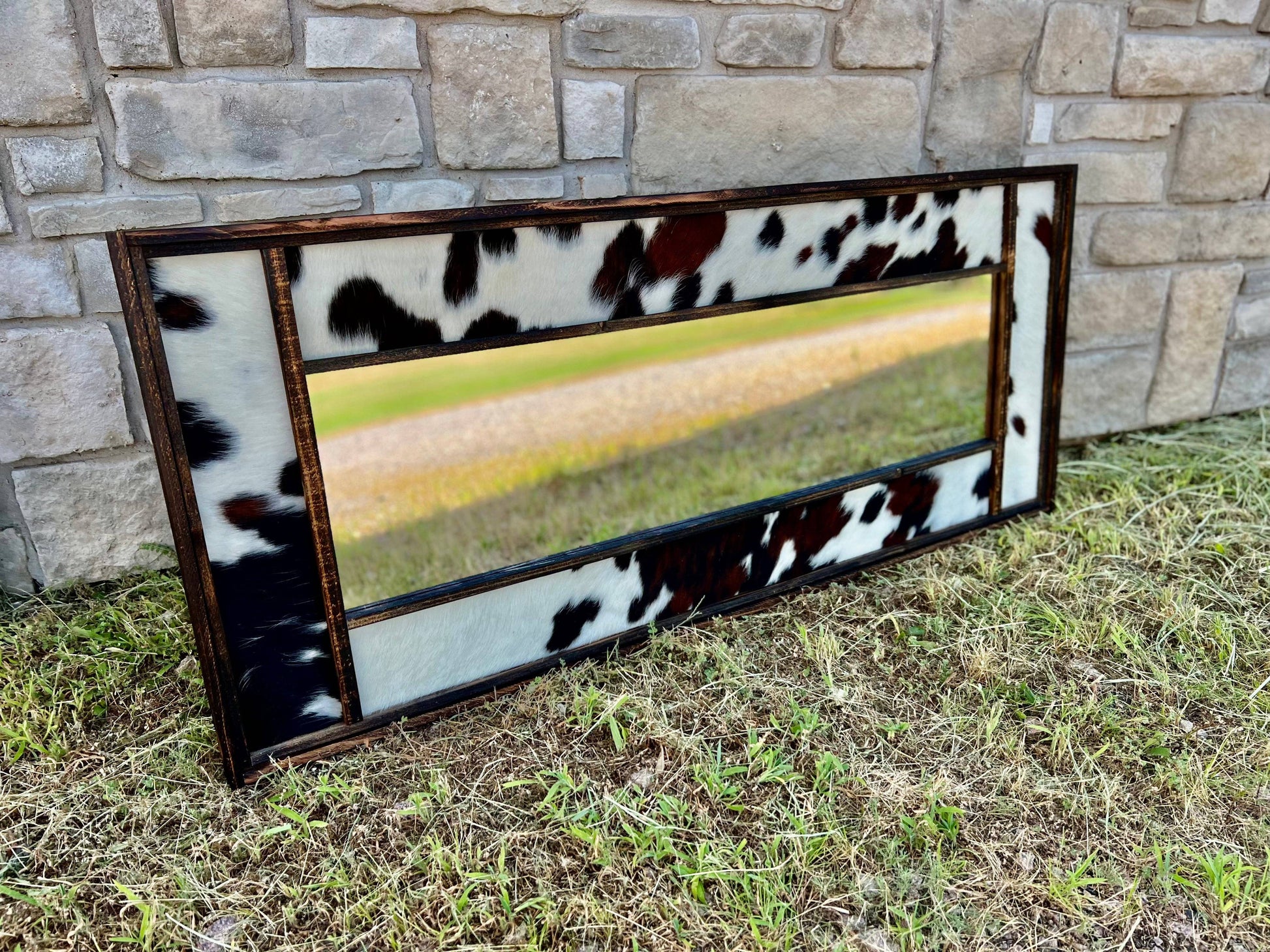 This Cowhide Mirror features a real cowhide frame, adding a touch of rustic charm to any space. The unique burned wood edging adds to its natural appeal, while the mirror provides a functional and stylish accent to any room. Elevate your decor with this one-of-a-kind piece.