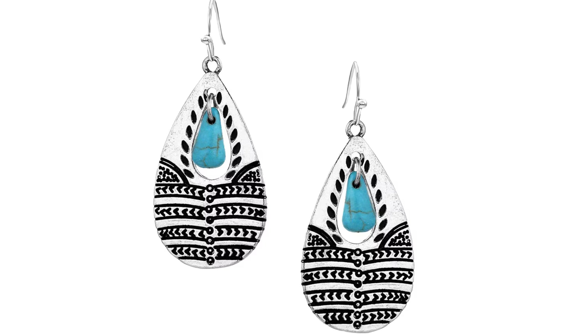 A teardrop shaped silver tone with plentiful etching is the base for this look. In the center there is an open cut, giving room for a crafted turquoise stone to move and will be sure to catch your eye. This earring hangs from a French wire.