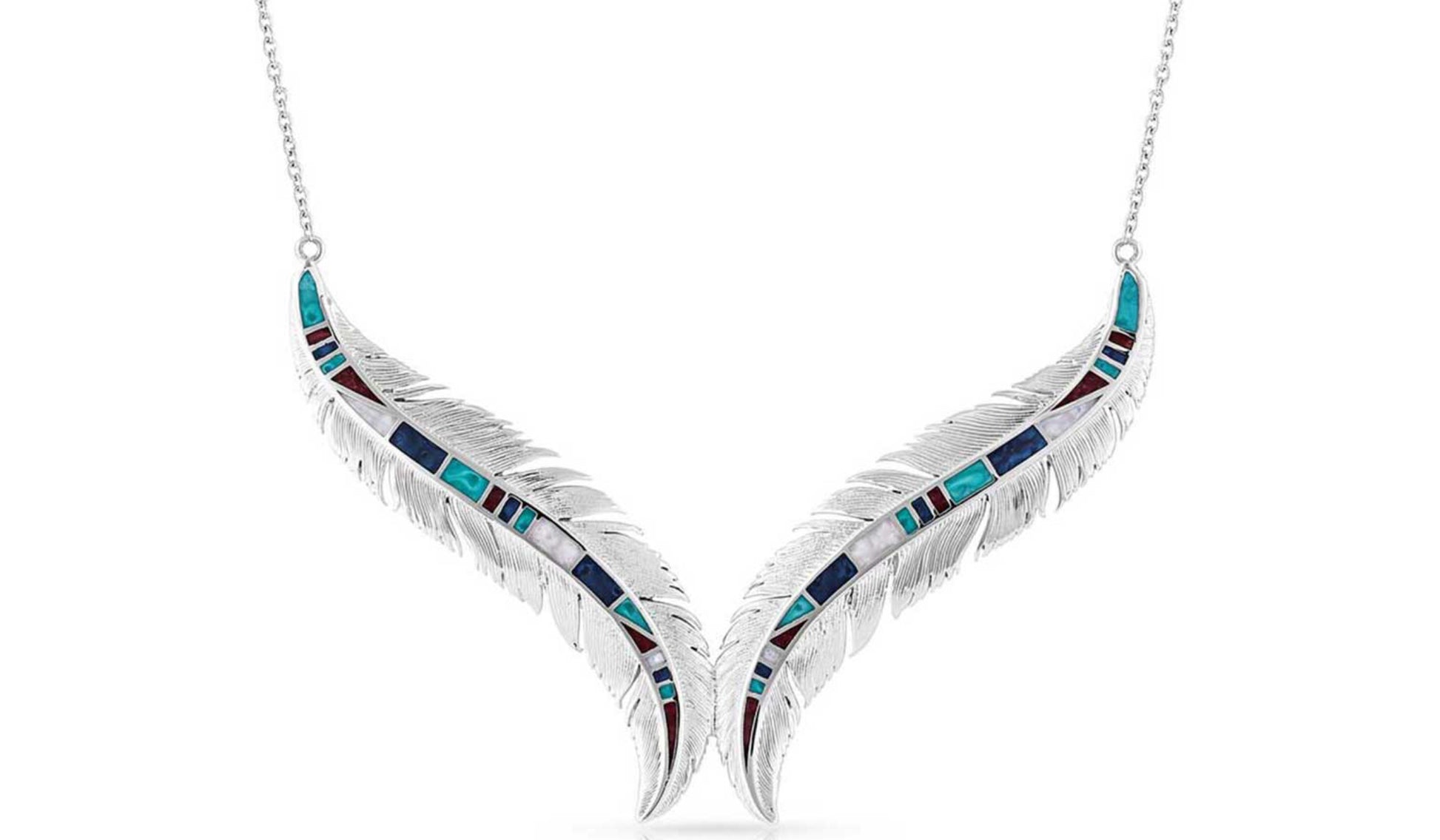 The Breaking Trail Feather Necklace symbolizes always taking the road less traveled. The incredible silver feathers attach to a 19 inch silver split chain on each side. Through the vein of the feather a lovely and unique geometric design with inlaid red agate, mother of pearl, onyx, and turquoise. Making this the perfect statement necklace to add to your collection.