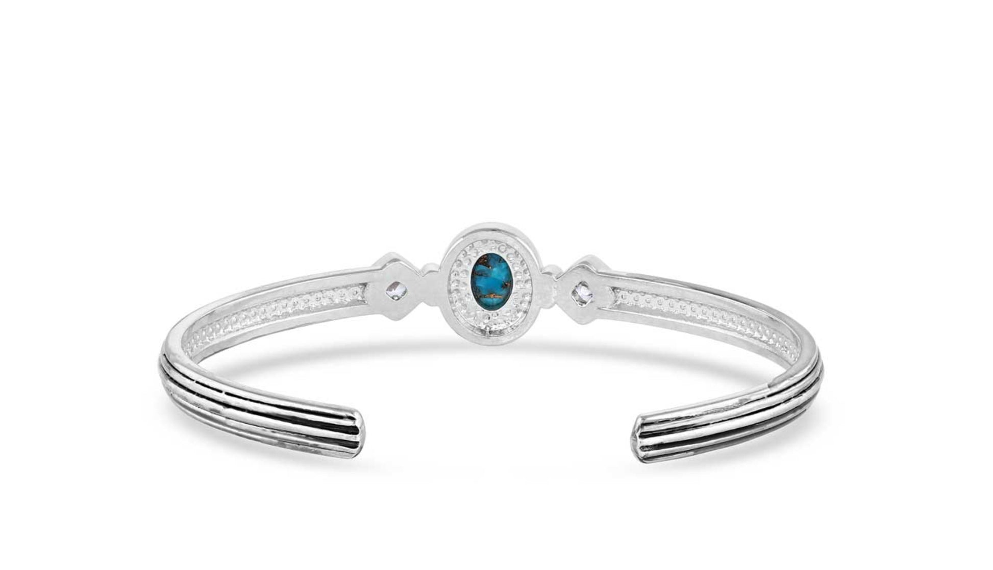 This cuff bracelet is remarkable. In the center of the silver cuff bracelet an oval compressed copper and turquoise stone sits in the center, surrounded by a radiating design. On either side two clear cubic zirconia stones that shine like the stars in the night sky.