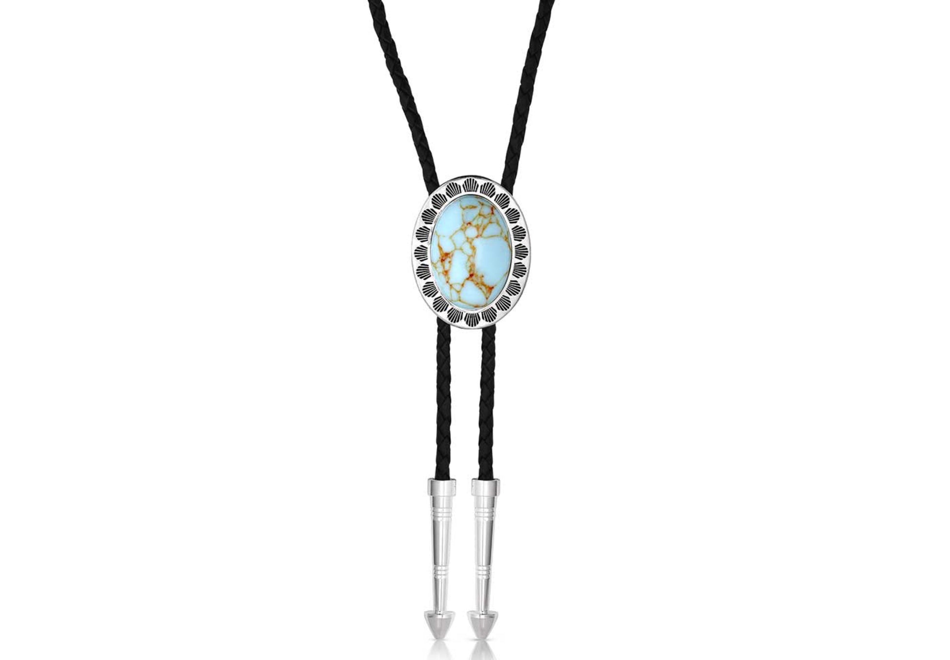 Elevate your style with the Turquoise Waters Bolo Tie. This bolo tie features a stunning oval shaped light turquoise stone. A silver tone border with simple etching encircles the turquoise stone. The black braided leather cord is nicely weighted with two silver tone arrow pointed tips.