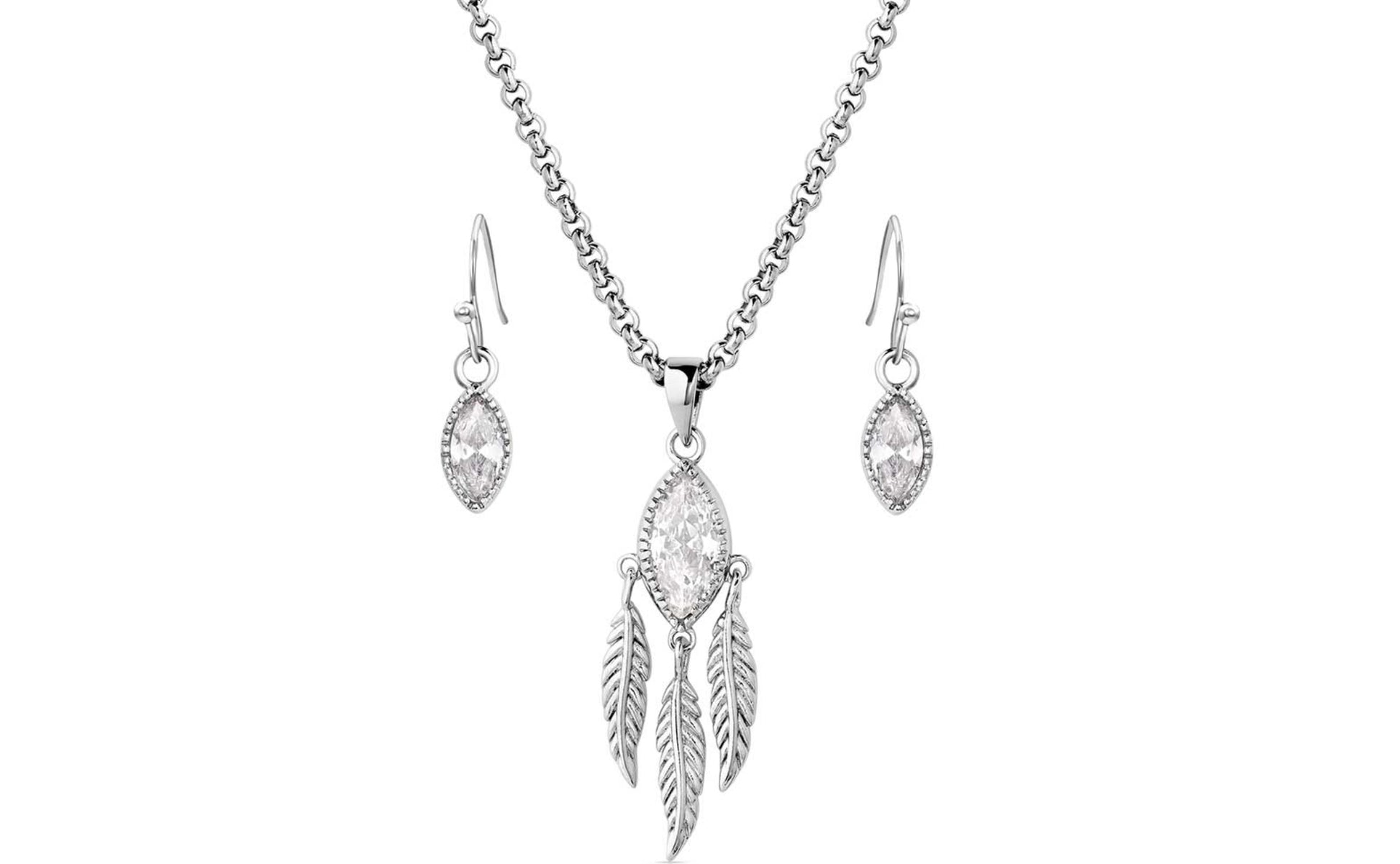 Catch the light with this stunning necklace and earrings set. The simplicity of this set makes it a great addition to any outfit. The necklace hangs from a 19 inch adjustable chain and features an almond shaped clear cubic zirconia crystal that sparkles with every movement. Dangling below the crystal are three silver tone feathers adding to the design and creating movement in the piece. The matching earrings are sparkling almond shaped clear cubic zirconia crystals matching the necklace.