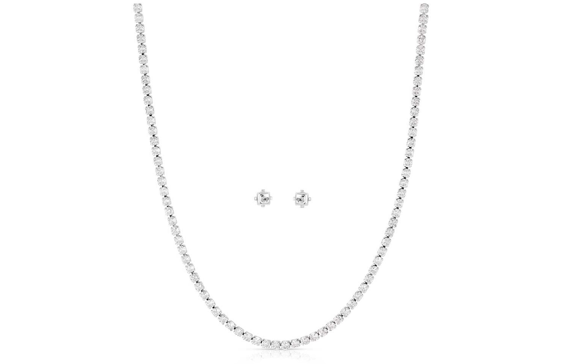 Made for those who love a little sparkle in their jewelry. The Touch of Starlight Jewelry Set has a simple, yet irresistible design. The design of the necklace features clear cubic zirconia crystals throughout the chain. The silver tone toggle clasp adds a unique element to the piece. The earrings are also clear cubic zirconia crystal studs, completing the look.