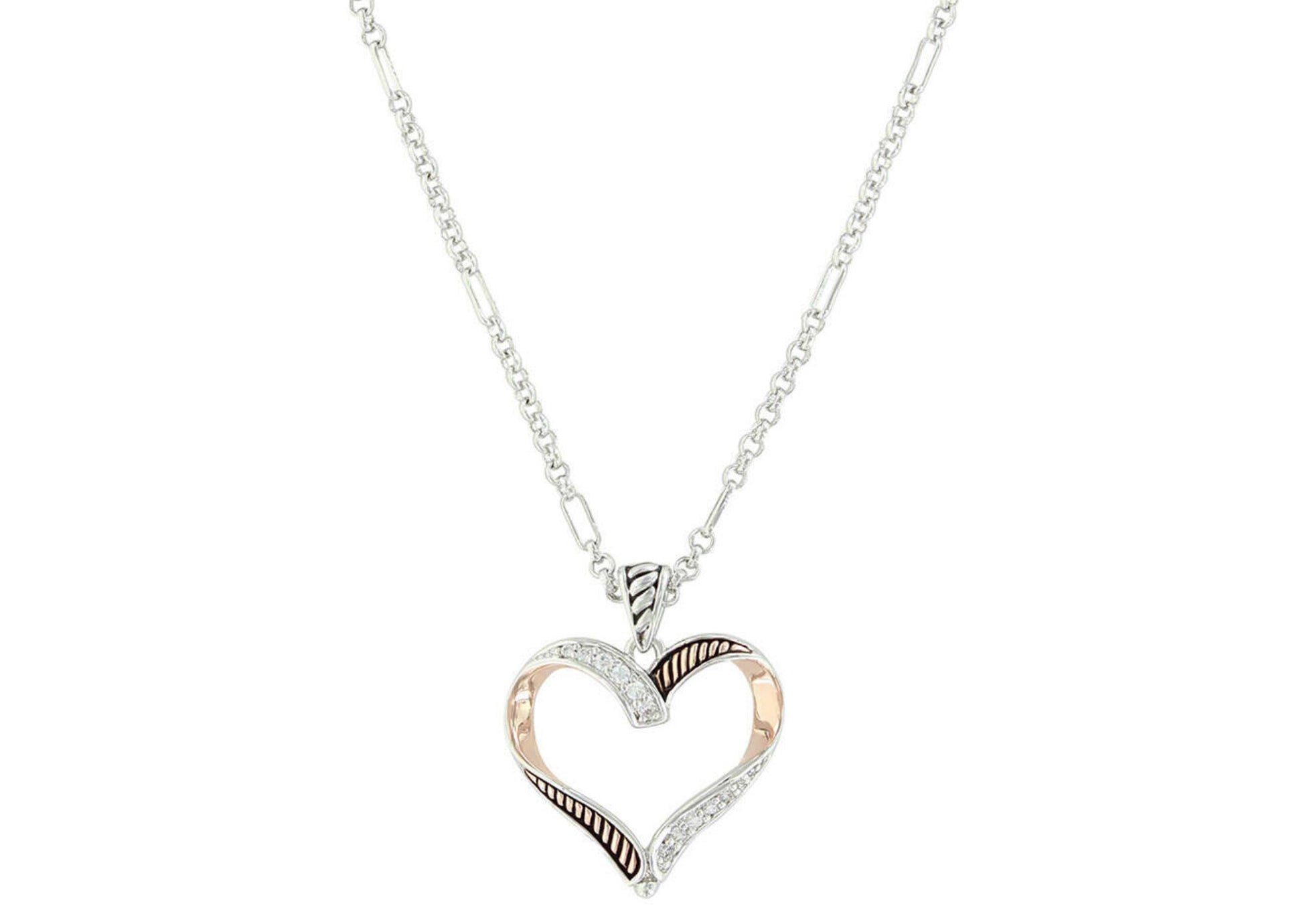 A whimsical open heart pendant with a twisting ribbon-like design of bright clear stones, smooth rose gold tones, and antiqued rose gold toned rope combined to create a heart with various facets.