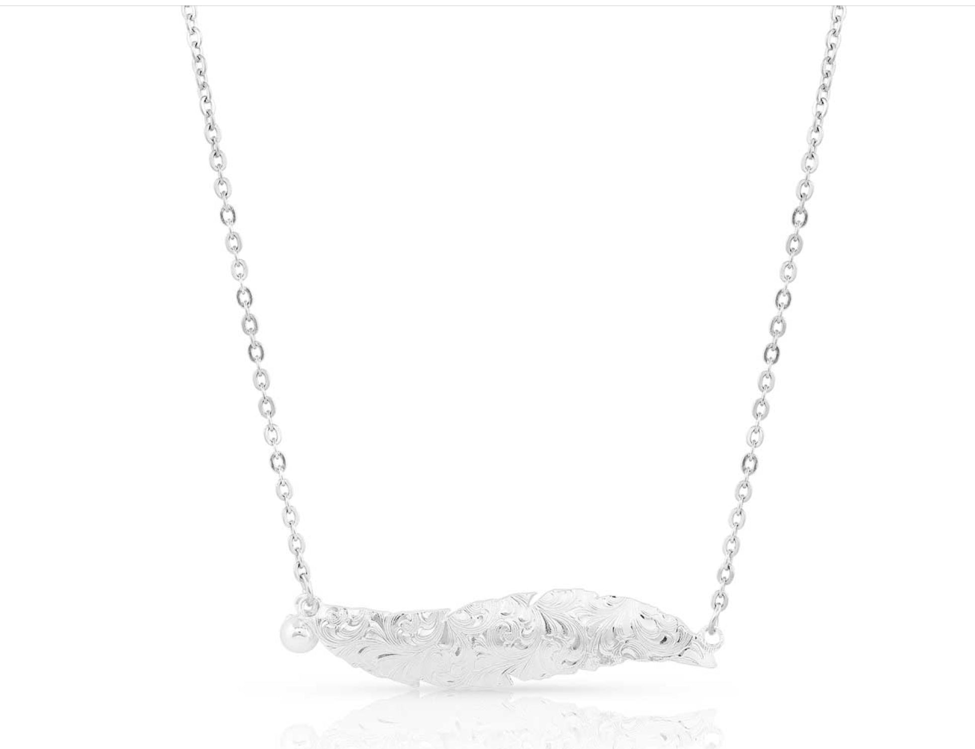 Turn heads with this stunning silver finished and American made necklace. Crafted with a delicate feather design this necklace is accented with a blue clear cubic zirconia crystal for a perfect pop of color.