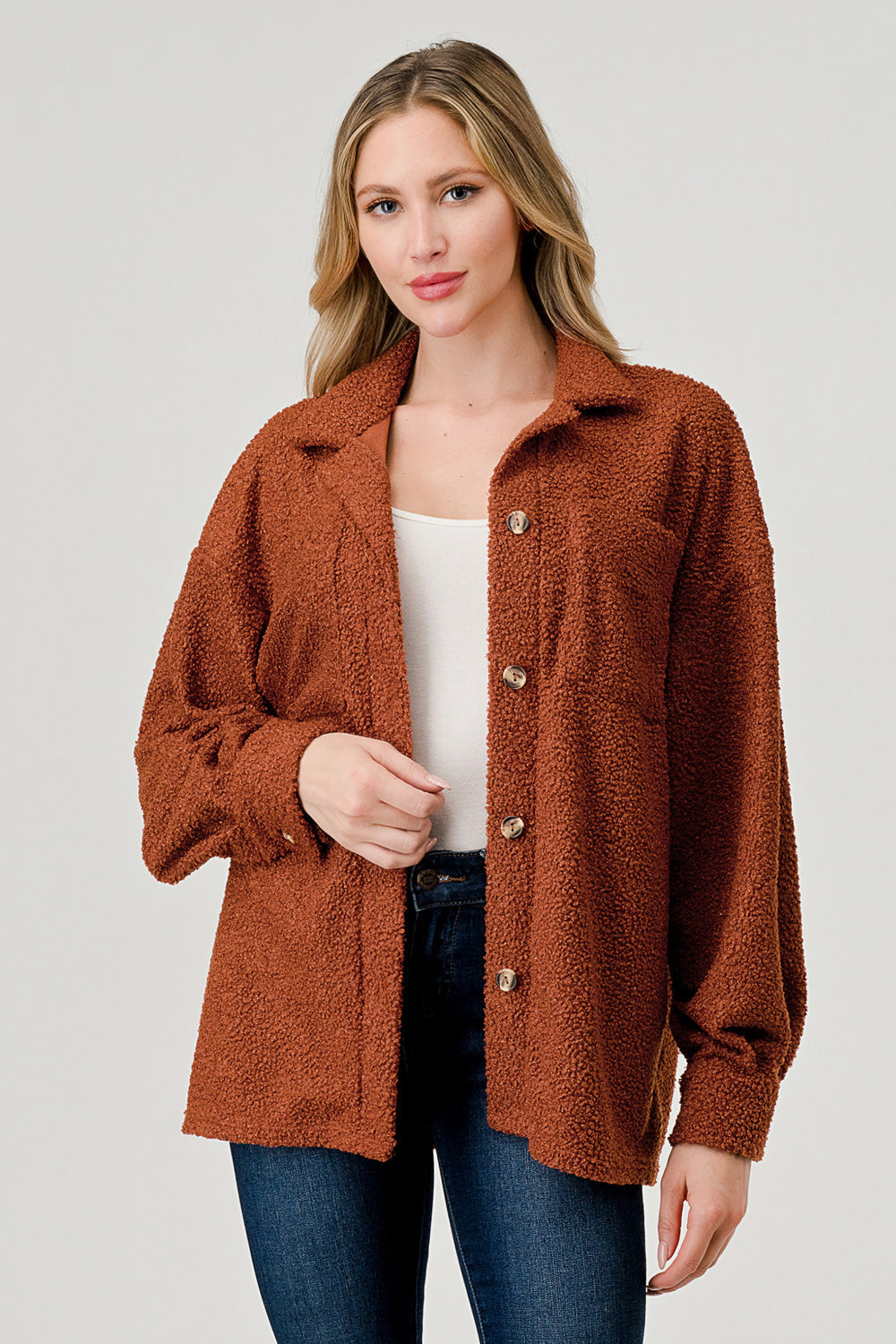 Teddy- Boucle look Button down Top /Jacket (shacket) perfect for layering over other tops. The perfect polished, yet casual look. Made in USA