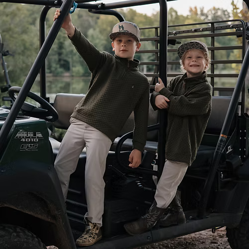 Fleece is a soft-shell interlock material with lower zipped pockets, a deep quarter-zip neck, and an elastic waist hem.